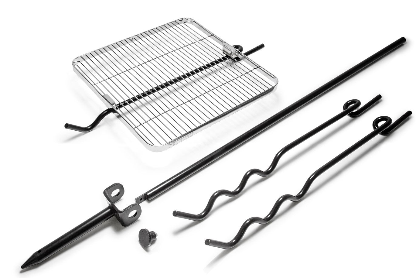 2 arme med kroge til gryder og 1 arm med en rist på, hvor du kan tilberede brød, eller grille pølser.