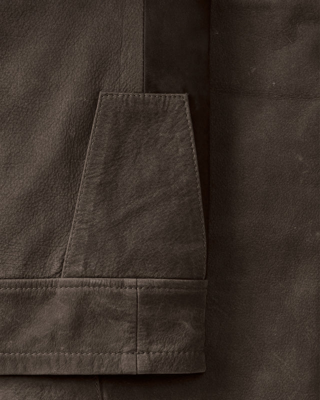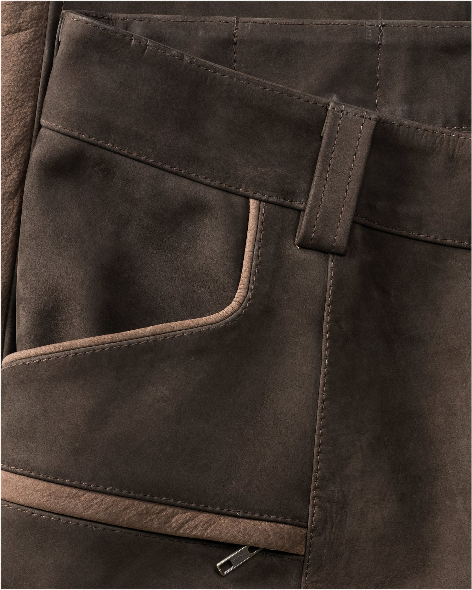 Rugged jagtbukser fremstillet af blødt okselæder i et kontrastfarvet design. Det slidstærke læder har en polyesterforing på indersiden, som gør det nemt at tage bukserne af og på. To cargo-lommer med trykknaplukning, en lynlåslomme på højre lår og en baglomme med knap. Benmanchetterne er dobbelte på indersiden for at beskytte mod slid fra støvler.